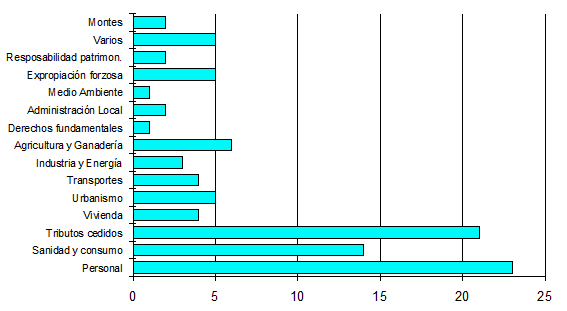 Debemos destacar el gran peso de la conflictividad derivada de la gestión de tributos cedidos, (el 21 por ciento del total de sentencias y el 25 por ciento de los recursos). Se aprecia un incremento notable de la litigiosidad por razón de la gestión del Impuesto sobre Sucesiones y Donaciones (39 recursos), detectándose discrepancias de valoración entre la Hacienda estatal y la Diputación General de Aragón, que han movido a ésta última a interponer diversos recursos.